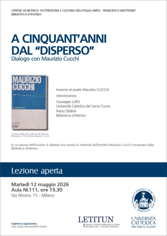 L’incontro è organizzato dal Centro di Ricerca “Letteratura e Cultura dell’Italia Unita – Francesco Mattesini” e dalla Biblioteca della sede di Milano dell’Università Cattolica.