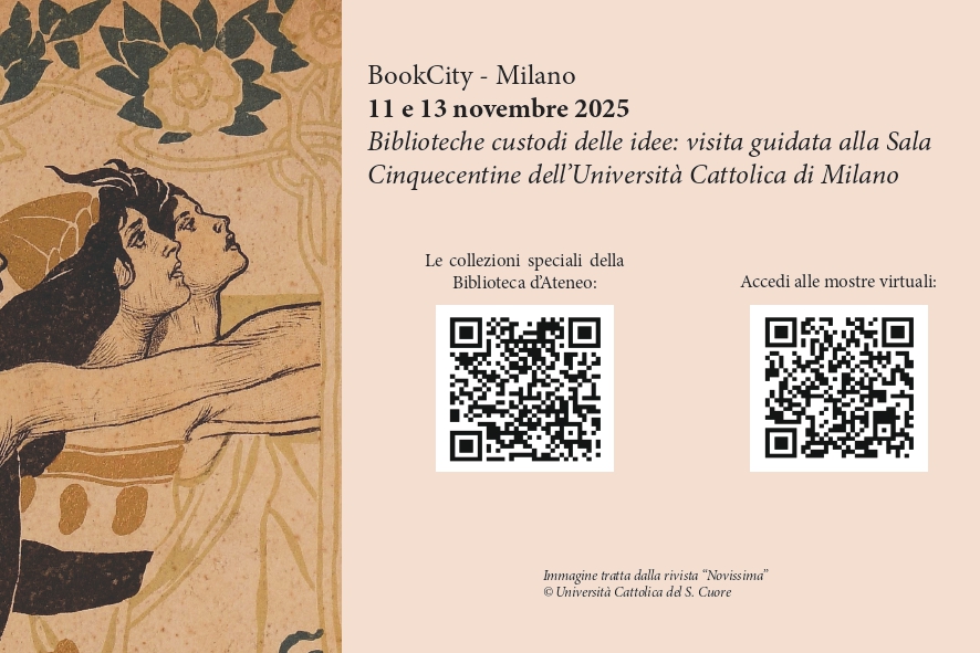 Quest’anno anche la Biblioteca della sede di Milano ospiterà due visite guidate dal titolo Biblioteche custodi delle idee. Si tratta di due incontri – l’11 e il 13 novembre – che si terranno presso la Sala Cinquecentine dalle ore 19,00 alle ore 20,00 in cui verranno illustrati dal personale bibliotecario alcuni dei tesori che fanno parte delle Collezioni speciali dell’Università Cattolica: dalle tavolette sumeriche ai codici del Seicento, dai classici del Novecento in prima edizione – come Giuseppe Ungaretti, Giorgio Caproni, Dino Buzzati e altri – il percorso porterà fino alle soglie degli anni Duemila. La Biblioteca dell’Università Cattolica conserva un patrimonio librario e documentario inestimabile che per questa occasione sarà eccezionalmente aperto al pubblico di BookCity.