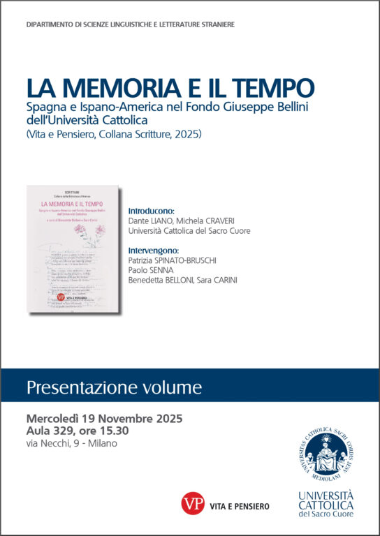 Mercoledì 19 novembre alle 15,30, presso l’Aula 329 dell’edificio di Via Necchi 9, si è tenuta la presentazione del volume La memoria e il tempo. Spagna e Ispano-America nel Fondo Giuseppe Bellini dell’Università Cattolica. Il libro è il quarto della collana “Scritture”, serie di studi in open access editi da Vita e Pensiero e promossi dalla Biblioteca d’Ateneo con l’intento di approfondire e valorizzare le proprie collezioni.