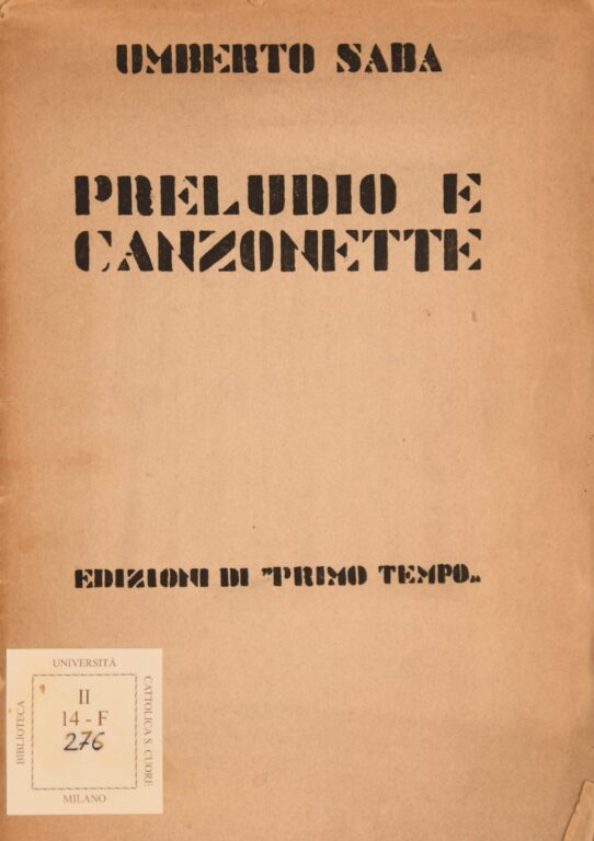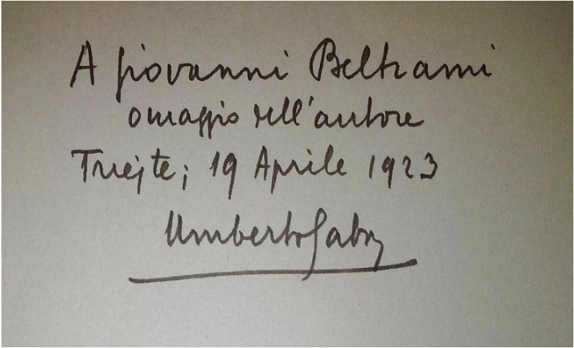 Nel Fondo Piccoli-Addoli è conservato un esemplare di Preludio e canzonette di Umberto Saba: si tratta di un’esile brossura di cinquanta pagine (14,5 x 20,4 cm), con cinque finalini xilografici di Nicola Galante tirata in 400 esemplari numerati e stampata a Torino dalle Edizioni di «Primo Tempo» nel 1923. Tra le pagine del volume si legge la seguente dedica autografa: «A Giovanni Beltrami | omaggio dell’autore | Trieste; 19 aprile 1923 | Umberto Saba». Il dedicatario, Giovanni Beltrami (1860-1926), oltre che pittore e consigliere comunale, era stato anche giornalista d’arte per il «Corriere della Sera» durante la direzione del fondatore del quotidiano, Eugenio Torelli-Viollier. Negli ultimi anni della sua vita Beltrami spostò i suoi interessi dedicandosi all’attività editoriale. Divenne così condirettore insieme a Guido Treves del celebre periodico «L’Illustrazione italiana», subentrando a Emilio Treves, morto nel 1916, ed entrò in qualità di consigliere delegato nella direzione della stessa Società anonima Fratelli Treves dal 1916 al 1926, anno in cui anche Beltrami si spense e la casa editrice si fuse con la Tumminelli.