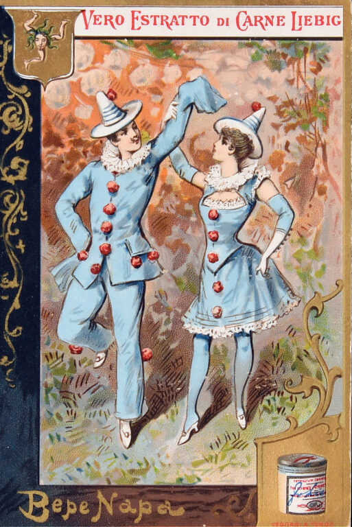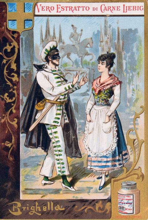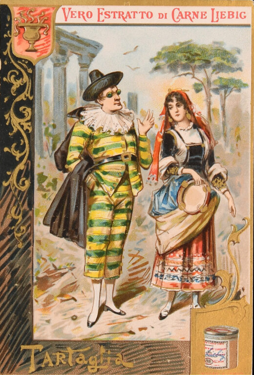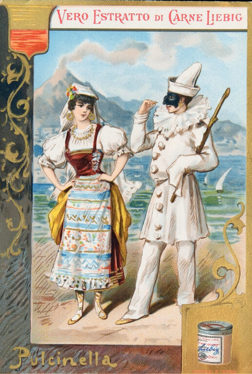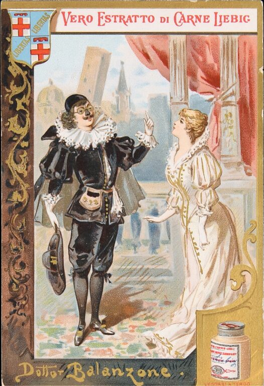 Chi è cresciuto tra gli anni Cinquanta e Settanta del secolo scorso, come molti dei nostri genitori, o nei decenni precedenti, come i nostri nonni, conosce sicuramente le figurine Liebig, che sono state l’oggetto del desiderio della maggior parte dei ragazzini di quegli anni. La Liebig[1], ditta manifatturiera del famosissimo estratto di carne, aveva iniziato fin dal lontano 1872 (o 1873, secondo alcuni studiosi) a stampare delle figurine per reclamizzare il suo prodotto. Sulla scia di una moda nata in Francia intorno alla metà dell’Ottocento, ossia la scelta da parte delle aziende di offrire piccoli regali con l’acquisto della merce[2], la Liebig diede vita alle proprie figurine, stampate in cromolitografia, una tecnica all’avanguardia per l’epoca. Le immagini erano inizialmente inserite nelle confezioni del prodotto, mentre in seguito venivano consegnate al cliente dietro la presentazione di punti attestanti l’acquisto di un certo numero di confezioni.